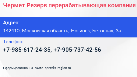 Чермет-Резерв, перерабатывающая компания по адресу 142410, Московская область, Ногинск, Бетонная, 3а в дальнейшем Организация, размещена в следующих категориях: