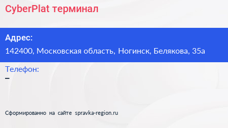 CyberPlat, терминал по адресу 142400, Московская область, Ногинск, Белякова, 35а в дальнейшем Организация, размещена в следующих категориях: