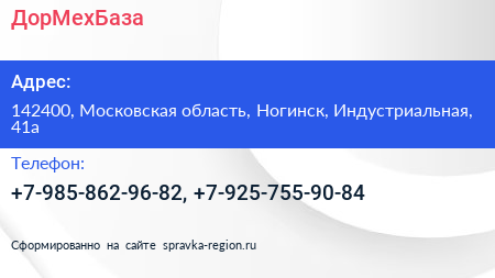 ДорМехБаза по адресу 142400, Московская область, Ногинск, Индустриальная, 41а в дальнейшем Организация, размещена в следующих категориях: