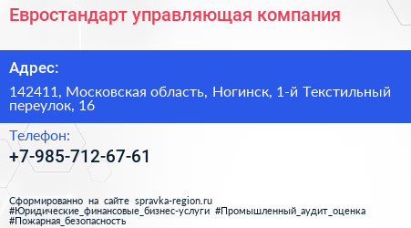 Евростандарт, управляющая компания по адресу 142411, Московская область, Ногинск, 1-й Текстильный переулок, 16 в дальнейшем Организация, размещена в следующих категориях: