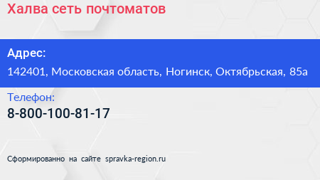 Халва, сеть почтоматов по адресу 142401, Московская область, Ногинск, Октябрьская, 85а в дальнейшем Организация, размещена в следующих категориях: