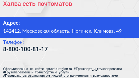 Халва, сеть почтоматов по адресу 142412, Московская область, Ногинск, Климова, 49 в дальнейшем Организация, размещена в следующих категориях:
