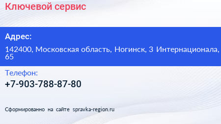 Ключевой сервис по адресу 142400, Московская область, Ногинск, 3 Интернационала, 65 в дальнейшем Организация, размещена в следующих категориях: