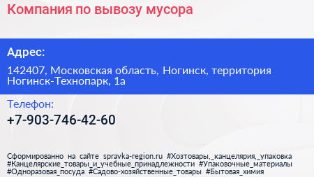 Компания по вывозу мусора по адресу 142407, Московская область, Ногинск, территория Ногинск-Технопарк, 1а в дальнейшем Организация, размещена в следующих категориях:
