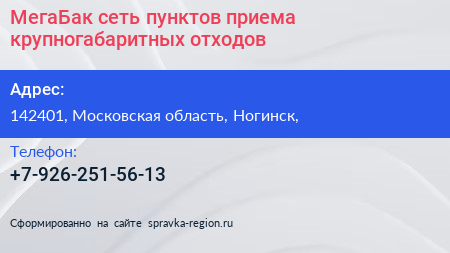 МегаБак, сеть пунктов приема крупногабаритных отходов по адресу 142401, Московская область, Ногинск, в дальнейшем Организация, размещена в следующих категориях:
