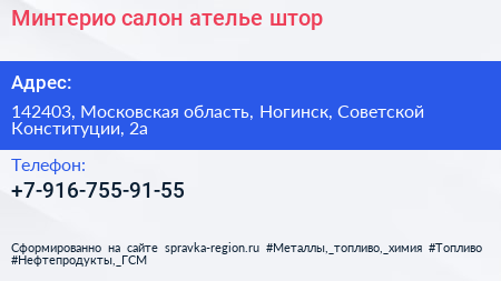 Минтерио, салон-ателье штор по адресу 142403, Московская область, Ногинск, Советской Конституции, 2а в дальнейшем Организация, размещена в следующих категориях: