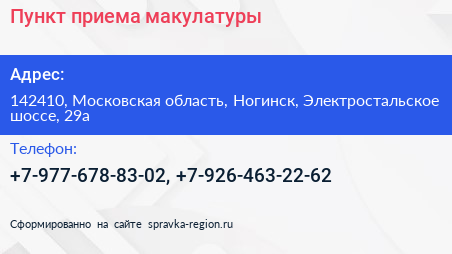 Пункт приема макулатуры по адресу 142410, Московская область, Ногинск, Электростальское шоссе, 29а в дальнейшем Организация, размещена в следующих категориях: