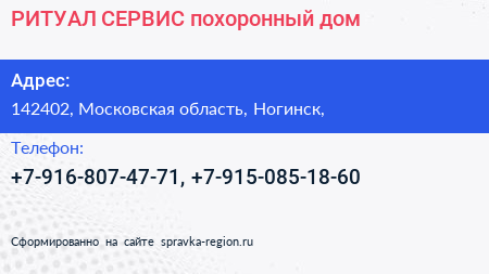 РИТУАЛ-СЕРВИС, похоронный дом по адресу 142402, Московская область, Ногинск, в дальнейшем Организация, размещена в следующих категориях: