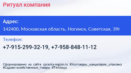 Ритуал, компания по адресу 142400, Московская область, Ногинск, Советская, 39г в дальнейшем Организация, размещена в следующих категориях: