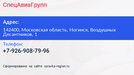 СпецАвиаГрупп по адресу 142400, Московская область, Ногинск, Воздушных Десантников, 1 в дальнейшем Организация, размещена в следующих категориях: