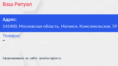 Ваш Ритуал по адресу 142400, Московская область, Ногинск, Комсомольская, 59 в дальнейшем Организация, размещена в следующих категориях: