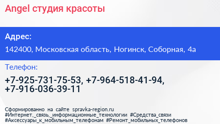 Angel, студия красоты по адресу 142400, Московская область, Ногинск, Соборная, 4а в дальнейшем Организация, размещена в следующих категориях: