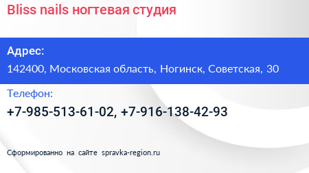 Bliss nails, ногтевая студия по адресу 142400, Московская область, Ногинск, Советская, 30 в дальнейшем Организация, размещена в следующих категориях: