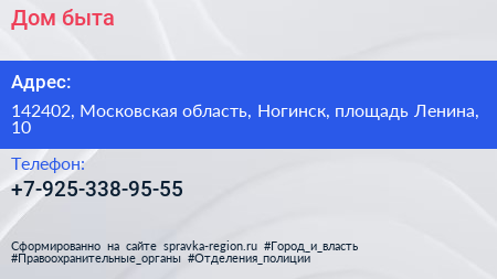 Дом быта по адресу 142402, Московская область, Ногинск, площадь Ленина, 10 в дальнейшем Организация, размещена в следующих категориях:
