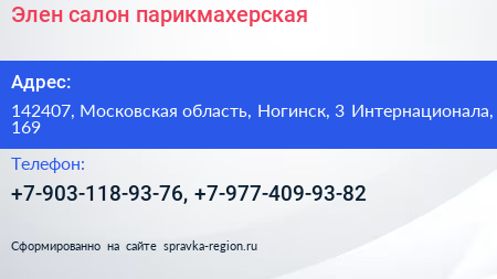 Элен, салон-парикмахерская по адресу 142407, Московская область, Ногинск, 3 Интернационала, 169 в дальнейшем Организация, размещена в следующих категориях: