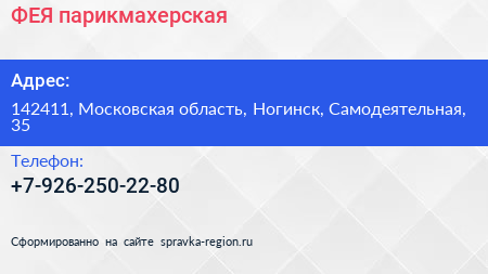 ФЕЯ, парикмахерская по адресу 142411, Московская область, Ногинск, Самодеятельная, 35 в дальнейшем Организация, размещена в следующих категориях: