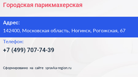 Городская парикмахерская по адресу 142400, Московская область, Ногинск, Рогожская, 67 в дальнейшем Организация, размещена в следующих категориях:
