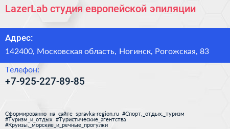 LazerLab, студия европейской эпиляции по адресу 142400, Московская область, Ногинск, Рогожская, 83 в дальнейшем Организация, размещена в следующих категориях: