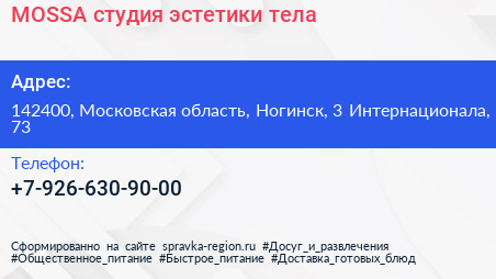 MOSSA, студия эстетики тела по адресу 142400, Московская область, Ногинск, 3 Интернационала, 73 в дальнейшем Организация, размещена в следующих категориях: