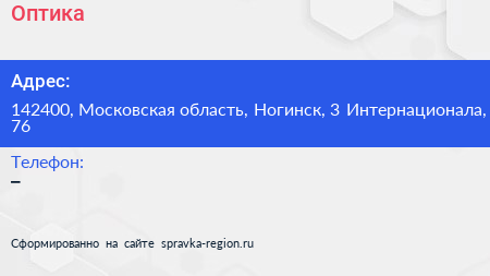 Оптика+ по адресу 142400, Московская область, Ногинск, 3 Интернационала, 76 в дальнейшем Организация, размещена в следующих категориях: