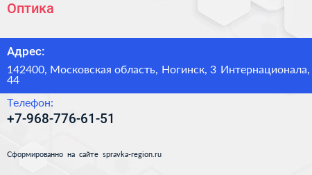 Оптика+ по адресу 142400, Московская область, Ногинск, 3 Интернационала, 44 в дальнейшем Организация, размещена в следующих категориях: