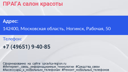 ПРАГА, салон красоты по адресу 142400, Московская область, Ногинск, Рабочая, 50 в дальнейшем Организация, размещена в следующих категориях: