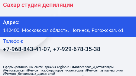 Сахар, студия депиляции по адресу 142400, Московская область, Ногинск, Рогожская, 61 в дальнейшем Организация, размещена в следующих категориях: