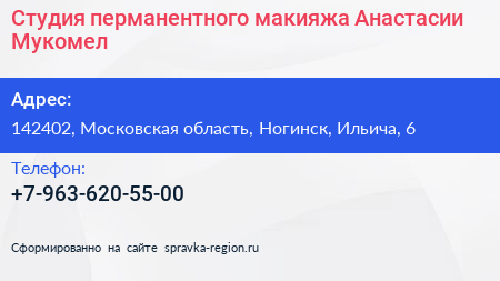 Студия перманентного макияжа Анастасии Мукомел по адресу 142402, Московская область, Ногинск, Ильича, 6 в дальнейшем Организация, размещена в следующих категориях: