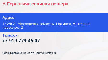 У Горыныча, соляная пещера по адресу 142403, Московская область, Ногинск, Аптечный переулок, 2 в дальнейшем Организация, размещена в следующих категориях: