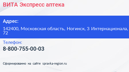 ВИТА Экспресс, аптека по адресу 142400, Московская область, Ногинск, 3 Интернационала, 72 в дальнейшем Организация, размещена в следующих категориях: