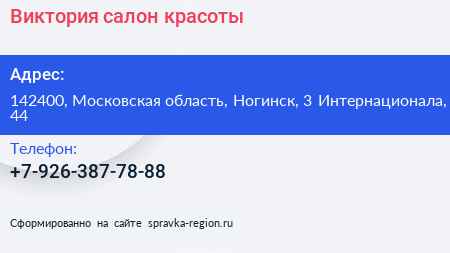Виктория, салон красоты по адресу 142400, Московская область, Ногинск, 3 Интернационала, 44 в дальнейшем Организация, размещена в следующих категориях: