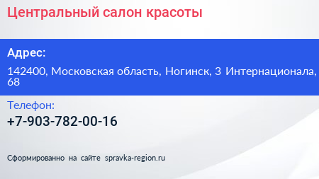 Центральный, салон красоты по адресу 142400, Московская область, Ногинск, 3 Интернационала, 68 в дальнейшем Организация, размещена в следующих категориях: