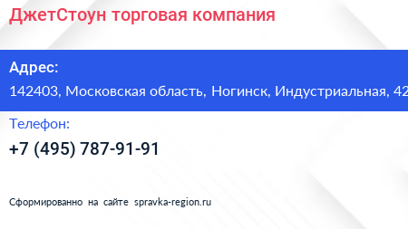 ДжетСтоун, торговая компания по адресу 142403, Московская область, Ногинск, Индустриальная, 42 в дальнейшем Организация, размещена в следующих категориях: