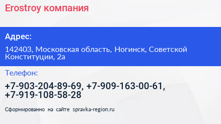 Erostroy, компания по адресу 142403, Московская область, Ногинск, Советской Конституции, 2а в дальнейшем Организация, размещена в следующих категориях: