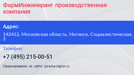 ФармИнжиниринг, производственная компания по адресу 142412, Московская область, Ногинск, Социалистическая, 2 в дальнейшем Организация, размещена в следующих категориях: