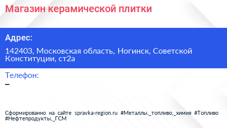 Магазин керамической плитки по адресу 142403, Московская область, Ногинск, Советской Конституции, ст2а в дальнейшем Организация, размещена в следующих категориях: