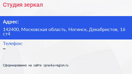 Студия зеркал по адресу 142400, Московская область, Ногинск, Декабристов, 16 ст4 в дальнейшем Организация, размещена в следующих категориях: