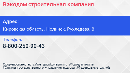 Вэкодом, строительная компания по адресу Кировская область, Нолинск, Рухледева, 8 в дальнейшем Организация, размещена в следующих категориях: