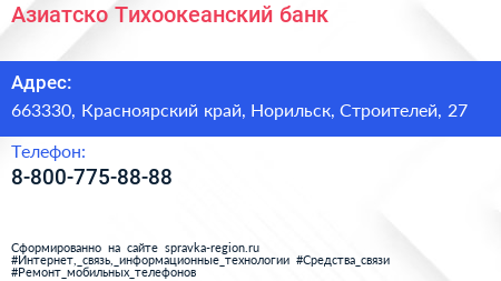 Азиатско-Тихоокеанский банк по адресу 663330, Красноярский край, Норильск, Строителей, 27 в дальнейшем Организация, размещена в следующих категориях:
