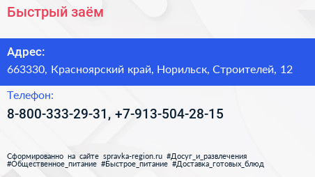 Быстрый заём по адресу 663330, Красноярский край, Норильск, Строителей, 12 в дальнейшем Организация, размещена в следующих категориях:
