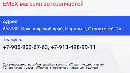 EMEX, магазин автозапчастей по адресу 663330, Красноярский край, Норильск, Строителей, 2а в дальнейшем Организация, размещена в следующих категориях: