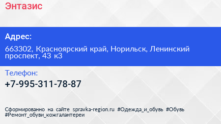 Энтазис по адресу 663302, Красноярский край, Норильск, Ленинский проспект, 43 к3 в дальнейшем Организация, размещена в следующих категориях: