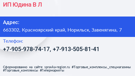 ИП Юдина В.Л. по адресу 663302, Красноярский край, Норильск, Завенягина, 7 в дальнейшем Организация, размещена в следующих категориях: