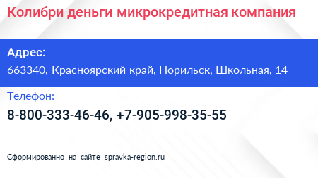 Колибри деньги, микрокредитная компания по адресу 663340, Красноярский край, Норильск, Школьная, 14 в дальнейшем Организация, размещена в следующих категориях: