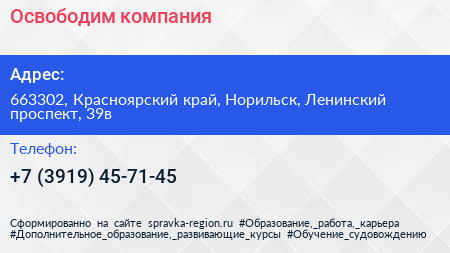 Освободим, компания по адресу 663302, Красноярский край, Норильск, Ленинский проспект, 39в в дальнейшем Организация, размещена в следующих категориях: