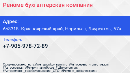 Реноме, бухгалтерская компания по адресу 663318, Красноярский край, Норильск, Лауреатов, 57а в дальнейшем Организация, размещена в следующих категориях: