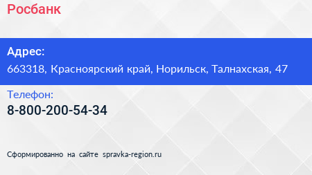 Росбанк по адресу 663318, Красноярский край, Норильск, Талнахская, 47 в дальнейшем Организация, размещена в следующих категориях: