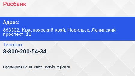 Росбанк по адресу 663302, Красноярский край, Норильск, Ленинский проспект, 11 в дальнейшем Организация, размещена в следующих категориях: