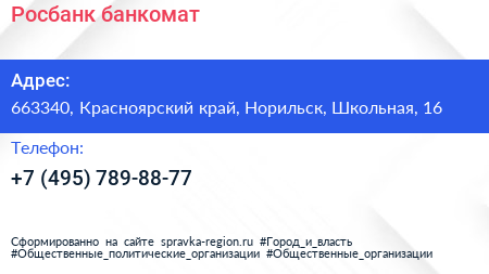 Росбанк, банкомат по адресу 663340, Красноярский край, Норильск, Школьная, 16 в дальнейшем Организация, размещена в следующих категориях: