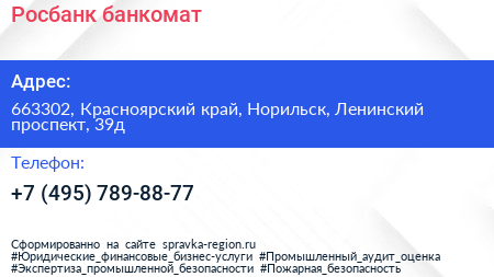 Росбанк, банкомат по адресу 663302, Красноярский край, Норильск, Ленинский проспект, 39д в дальнейшем Организация, размещена в следующих категориях: